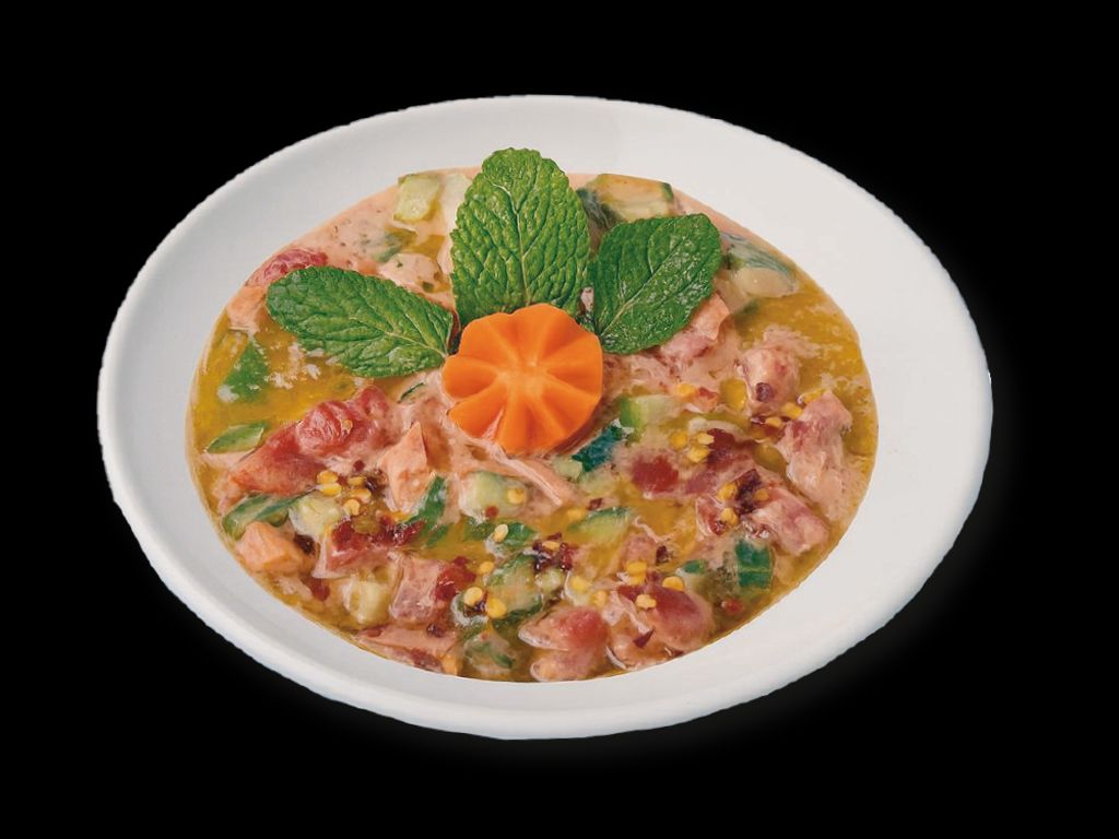 Dish of peanut butter salad with Full Dot Com's signature seasoning with cold pressed sesame oil