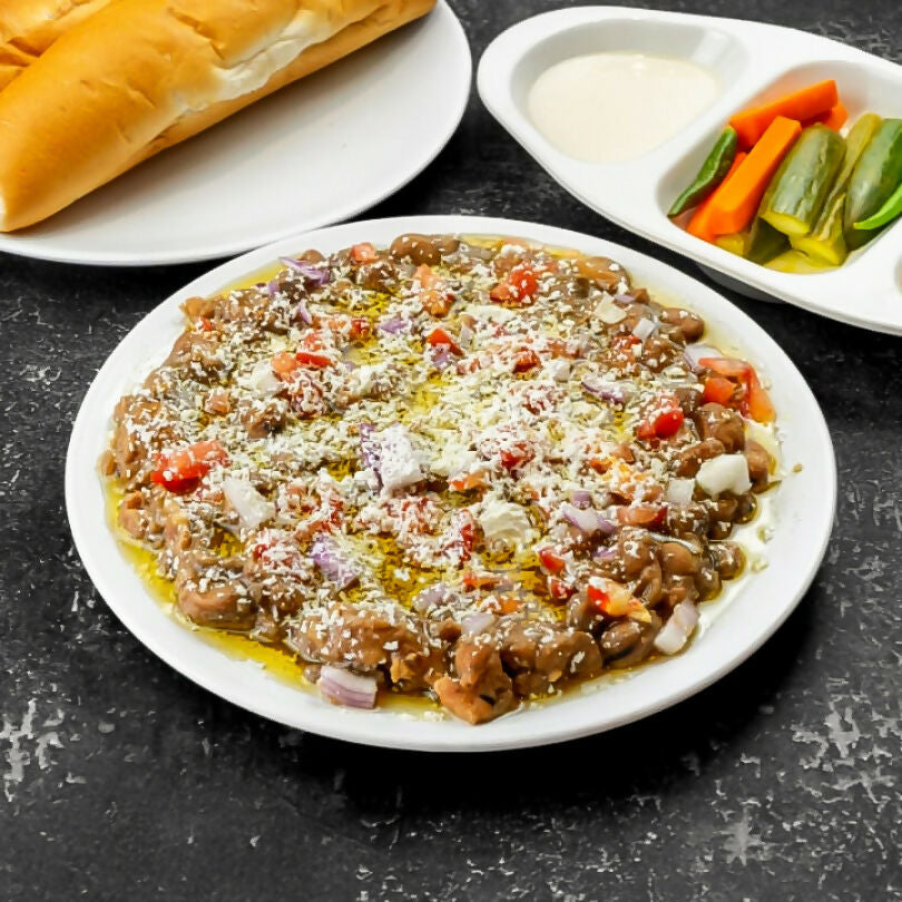 Cooked fava bean, tomato, onion, cheese, Alkandaka magic mixture and clod pressed sesame oil on top. Served with two bread, pickles and ground green chili pepper with peanut butter sauce.